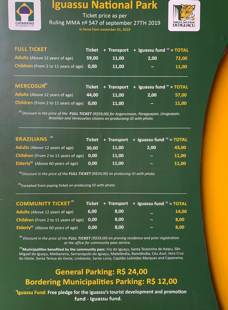 - Ticket de ingreso a Foz de Iguazú (Brasil)– R$72 (Reales Brasileros) o USD$16 aprox.
