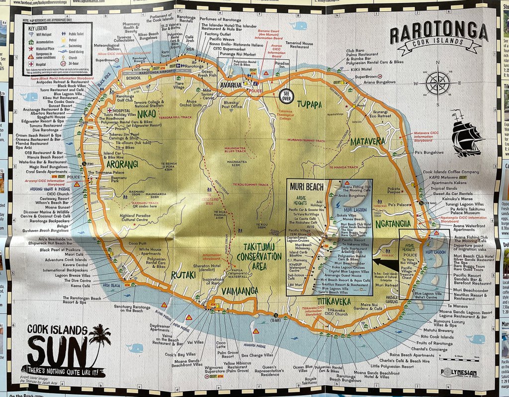 Raro es la isla más grande de Cook Islands y ¡la puedes recorrer en bici! – tiene 32 km de perímetro es bastante plano para recorrerla. Hacer eso nos tomó alrededor de dos horas en las e-bikes que rentamos en nuestro hospedaje por NZD$20 por día. Es muy fácil ubicarse y explorar la isla (lo verás en el mapa debajo). Eso fue nuestra actividad del día, tomamos nuestro tiempo y paramos en cada rincón.